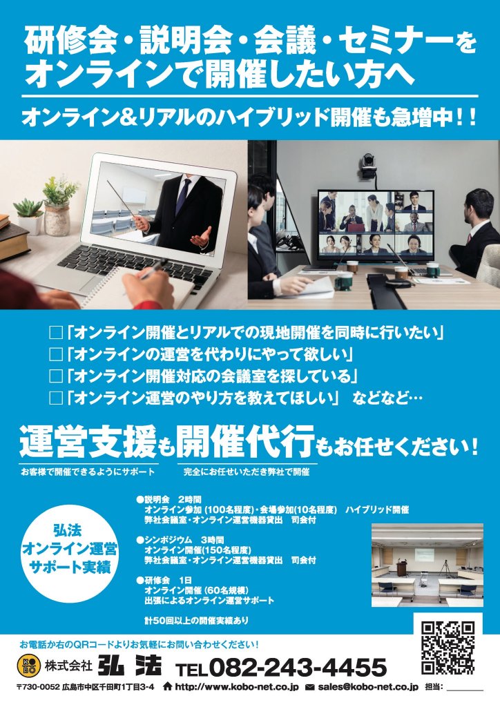コロナウイルス感染拡大に伴い、オンラインでの研修会、説明会、セミナーの企画が増えておりますが、同時に一部来場者にも対応したいというご要望が増えております。弊社本社の開始会議室を活用し、来場者にも対応しながら、オンラインの配信を行うイベントの運用代行や支援も行っております。